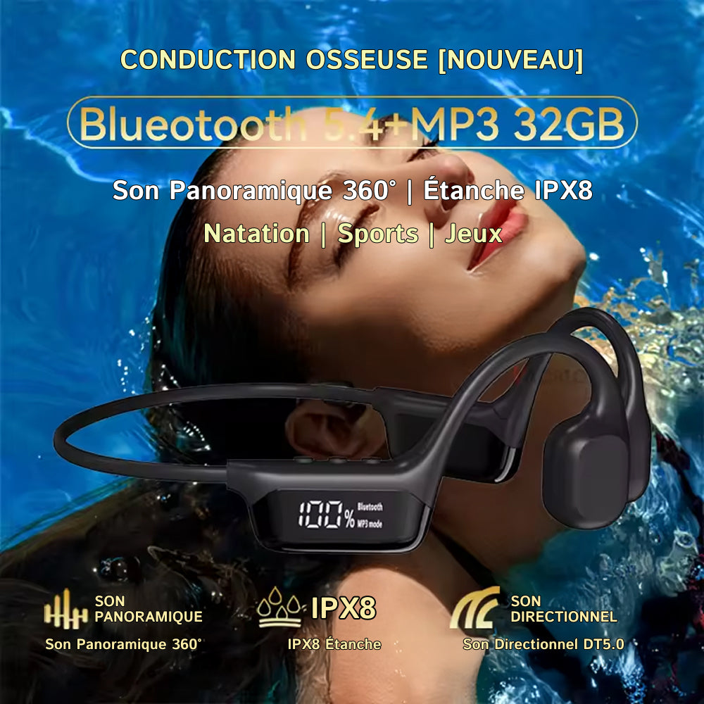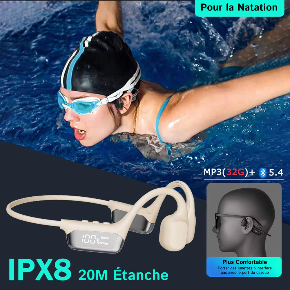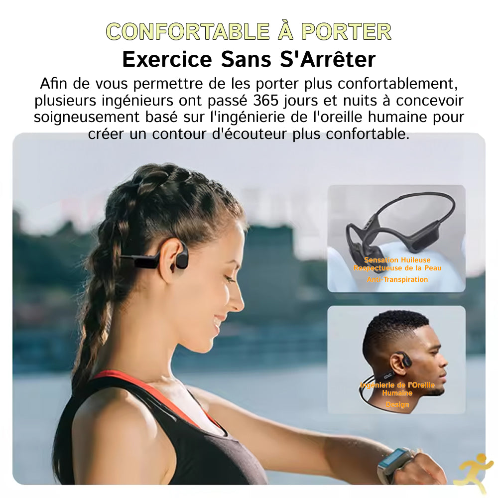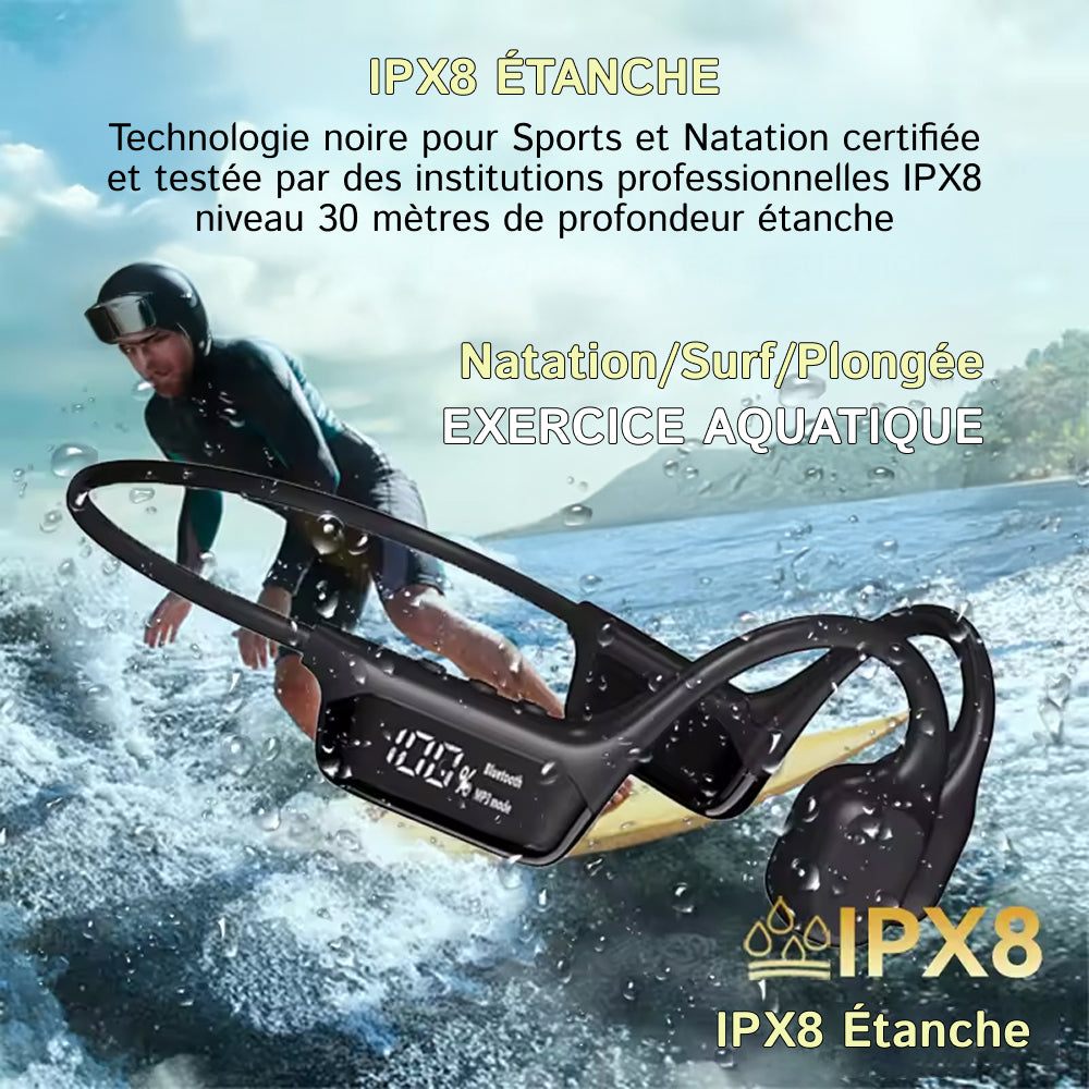 Écouteurs de course révolutionnaires à conduction osseuse avec étanchéité IPX8, stockage 32GB, et son panoramique 360° pour des performances sportives ultimes.